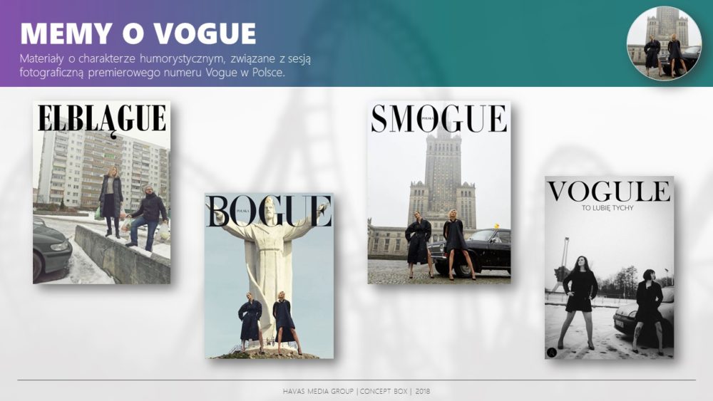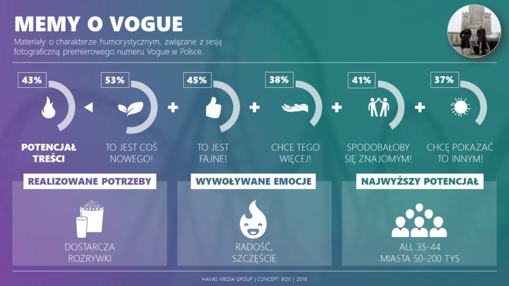 Dzięki memom odnoszącym się do premierowej okładki magazynu Vogue, wiadomość o debiucie tego tytułu na polskim rynku dotarła do ok. 19% internautów. Kontakt z memami nieznacznie częściej deklarowali mężczyźni (23%), respondenci w wieku 15-24 lata (24%), mieszkańcy wsi (21%) oraz osoby deklarujące dochód poniżej średniej (25%). Ten rodzaj kontentu bardziej podobał się jednak kobietom (23%), internautom w wieku 45-54 lata oraz mieszkańcom dużych miast (24%). W wymienionych grupach istotnie wyższy był również wskaźnik potencjału wiralowego („Chciałbym pokazać to moim znajomym”).