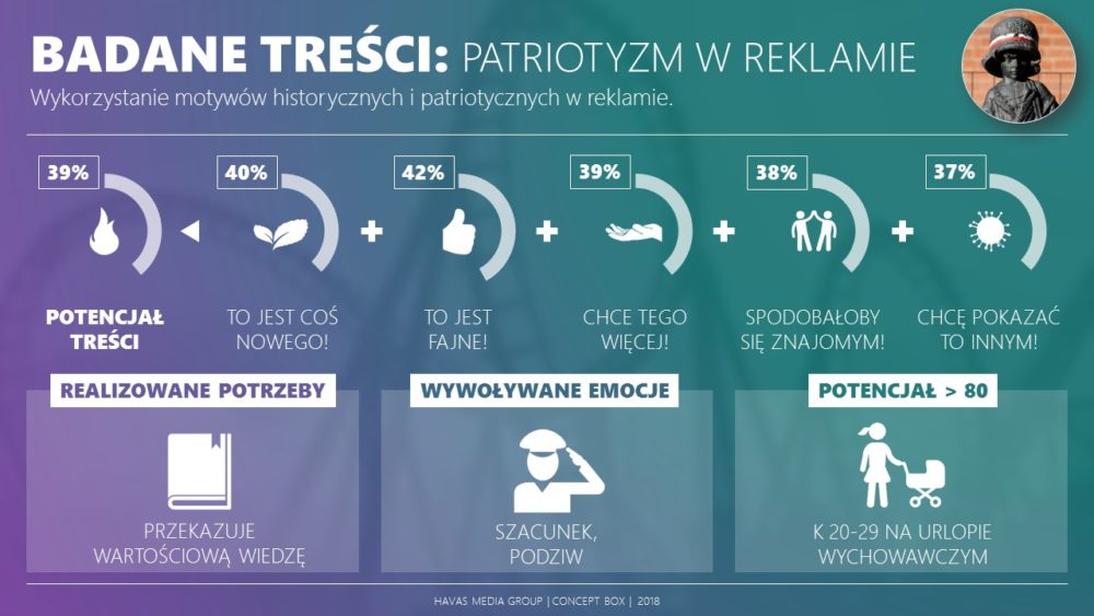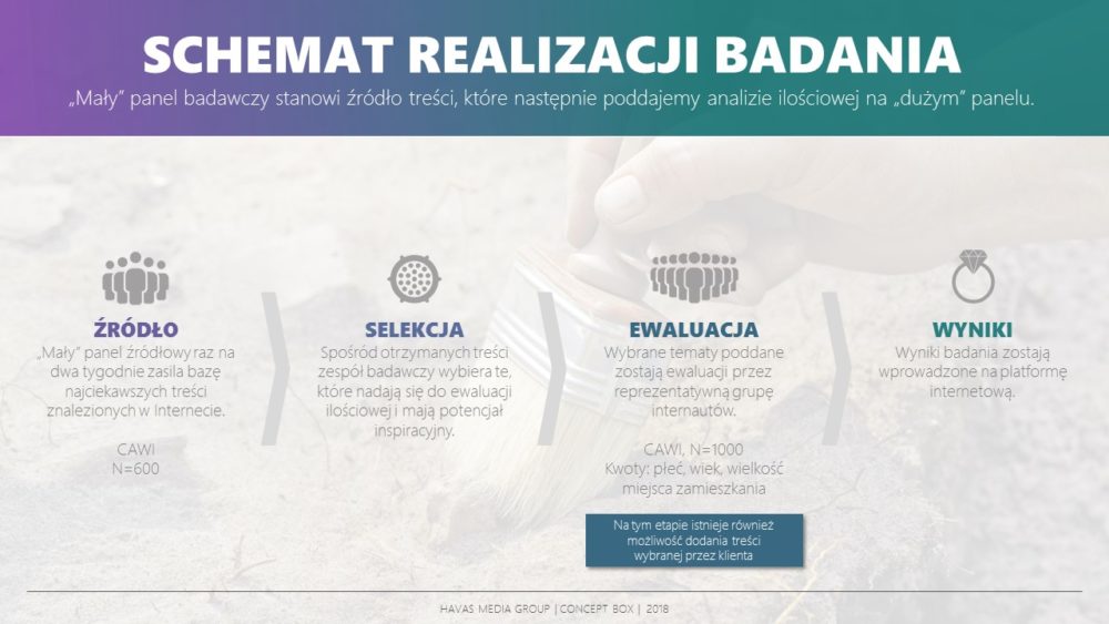Przedstawione wyniki pochodzą z pierwszego w Polsce badania potencjału treści internetowej „Concept Box”. Badanie przeprowadzono w marcu 2018 roku na reprezentatywnej (wiek, płeć, miejsce zamieszkania, dochód) próbie 1000 polskich internautów.