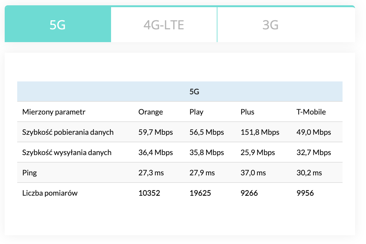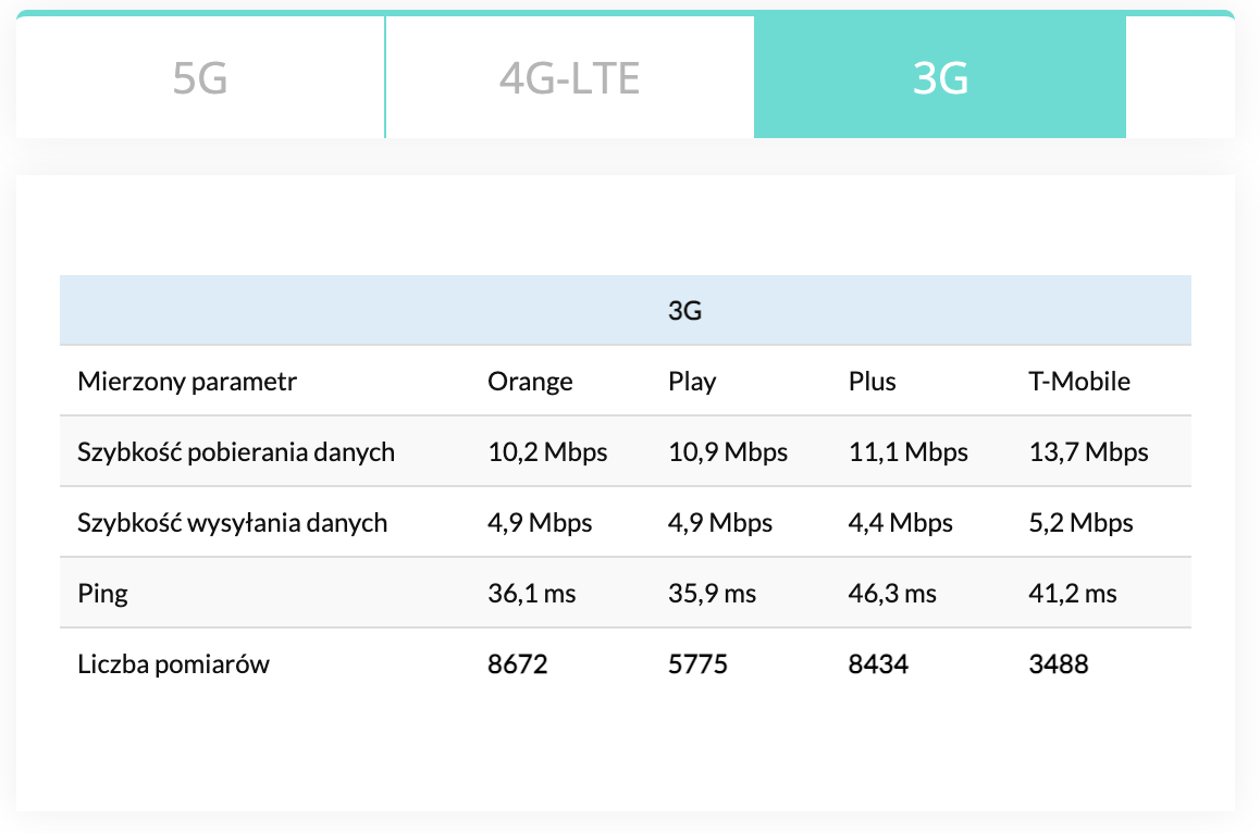Tabela wyników 5G/4G LTE/3G