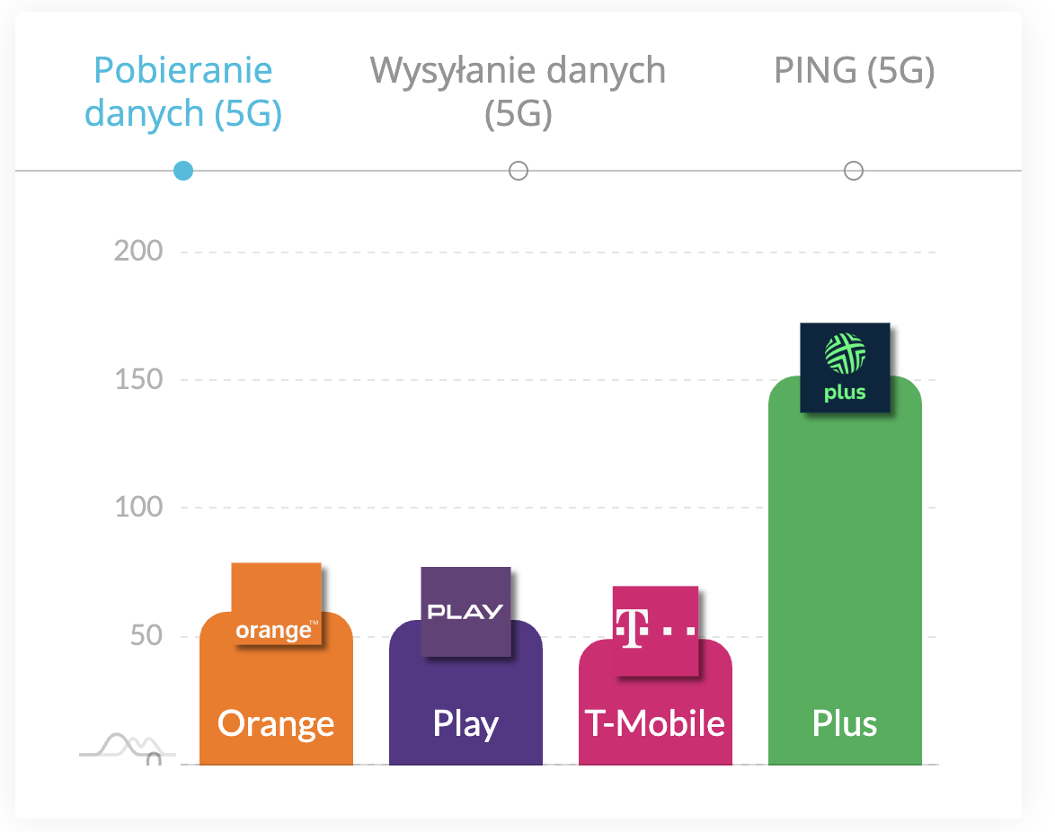 Już na pierwszy rzut oka widać ogromną przewagę, którą ma Plus nad pozostałymi operatorami jeżeli chodzi o pobieranie danych w 5G. Wynik 151,8 Mb/s wybija się na szczyt zestawienia. W dalszej kolejności pozostali konkurenci notują dość zbliżone wyniki.