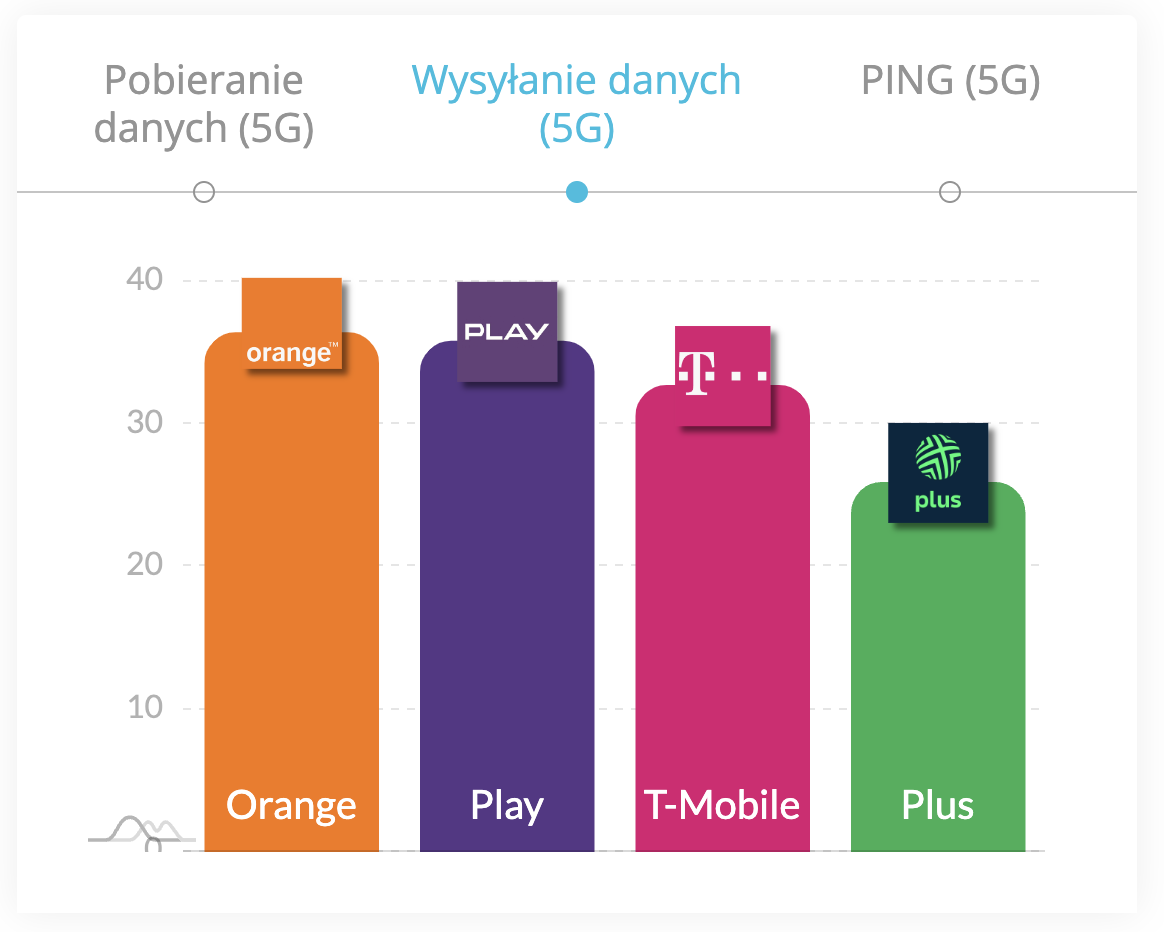 W drugiej kategorii, dotyczącej 5G, nie mamy już tak wyraźnego zwycięstwa żadnego z operatorów. Liderem jest natomiast Orange (36,4 Mb/s), które wyprzedziło Play (35,8 Mb/s). Na trzecim miejscu znalazł się T-Mobile, który traci do najwyższego stopnia podium już dość znacząco (32,7 Mb/s). Na dole stawki znalazł się Plus (25,9 Mb/s).