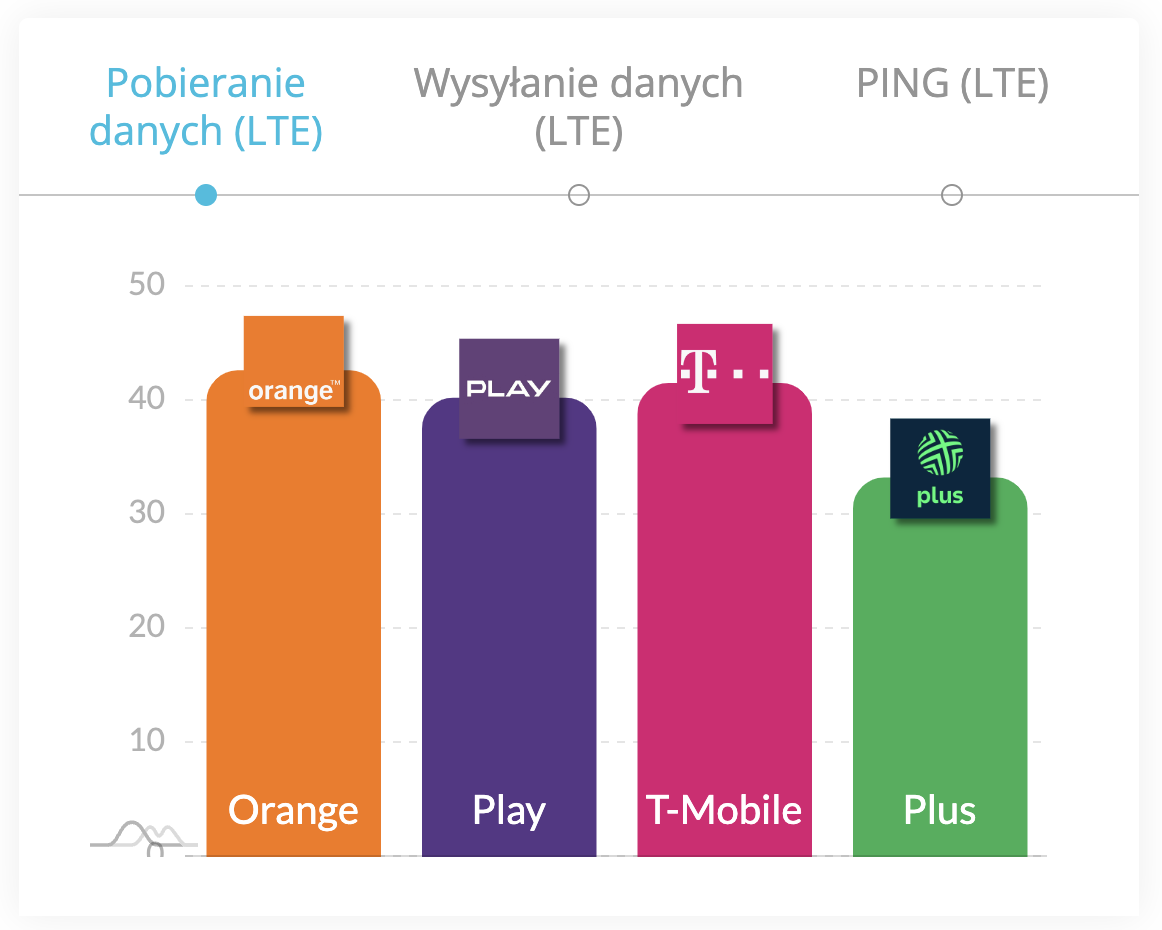 Orange utrzymało najwyższą pozycję w zestawieniu średniej szybkości pobierania danych LTE (42,6 Mb/s). Za jego plecami trwa zacięta rywalizacja. T-Mobile, czyli wicelider, osiągnął 41,5 Mb/s, a Play 40,2 Mb/s. Tabelę zamknął Plus (33,2 Mb/s.).