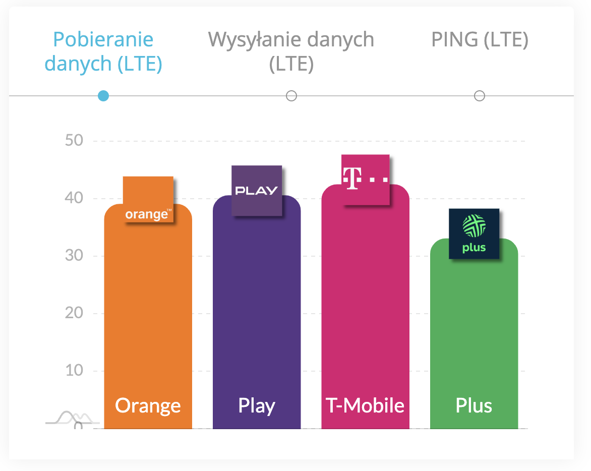 Jeśli chodzi o odsetek pomiarów według operatorów, Orange był najczęściej wybieraną siecią z 32,9% wszystkich wykonanych testów. Play znalazł się tuż za nim z 31,6% wszystkich pomiarów. Plus i T-Mobile odnotowały odpowiednio 18,7% i 16,8% i zauważalnie rzadziej w ich zasięgu były przeprowadzane badania Internetu mobilnego.