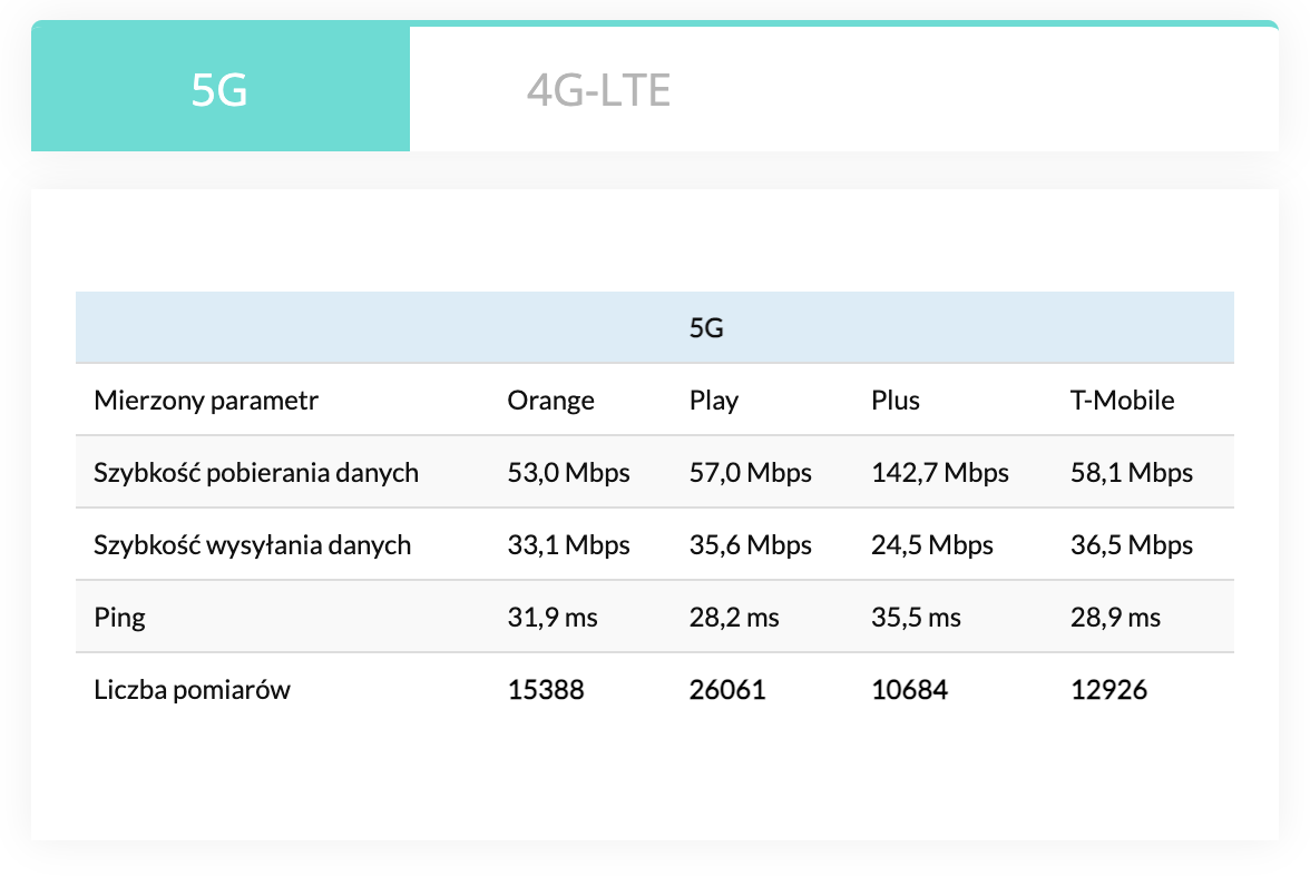 Tabela wyników 5G/4G LTE