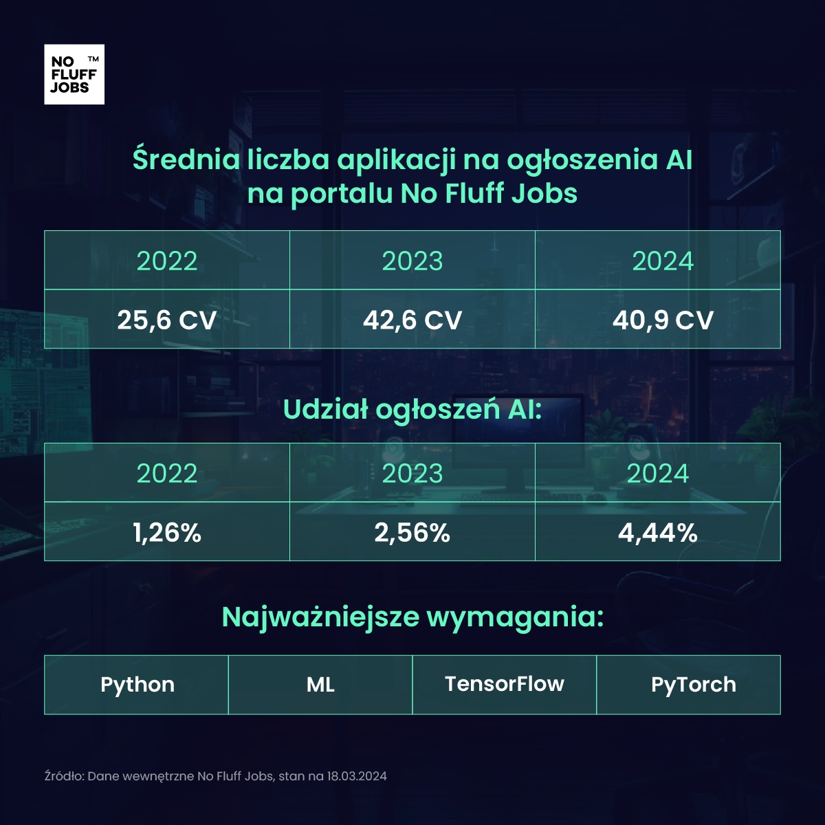 Zainteresowanie kandydatów i kandydatek pracą w dziedzinie AI również utrzymuje się na wysokim poziomie – średnia liczba CV wysyłanych w odpowiedzi na jedną ofertę wynosi w tym roku 40,9. W 2023 r. było to 42,6, aplikacji na jedno ogłoszenie, a w 2022 r. „tylko” 25,6. Według raportu No Fluff Jobs „AI na rynku pracy IT. Obawy, nadzieje i perspektywy” nawet co szósta osoba pracująca w IT dostrzega w rozwoju sztucznej inteligencji szansę na zmianę specjalizacji na związaną z tą tematyką.
