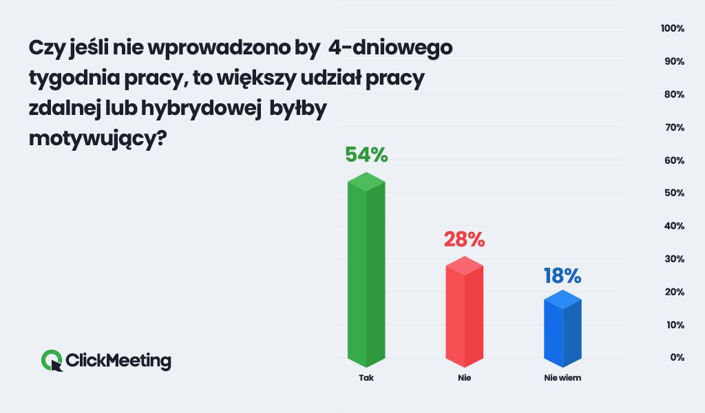 Wprowadzenie skróconego tygodnia pracy może być kluczowe w kwestii poprawy efektywności pracowników w firmach. Aby stało się to jednak możliwe, istotne jest korzystanie z nowoczesnych technologii oraz narzędzi do automatyzacji. Ankietowani w badaniu ClickMeeting wskazali, że jeżeli nie byłoby możliwości wprowadzenia 4-dniowego tygodnia pracy, to dodatkową motywacją byłoby oferowanie pracy zdalnej / hybrydowej (54 proc.), 28 proc. nie ma zdania na ten temat, a 18 proc. uważa, że nie motywowałoby ich to bardziej do wykonywania obowiązków. Respondenci zostali zapytani również o to, czy Polacy chętnie wykorzystują nowoczesne, cyfrowe narzędzia do pracy. Nawet 68 proc. sądzi, że tak, 16 proc. nie ma wyrobionej opinii na ten temat, 10 proc. uważa, że niechętnie, a 6 proc. twierdzi, że nie mamy możliwości i czasu, aby się tym zająć.