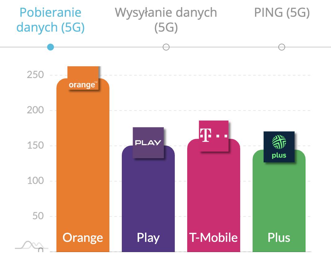 W maju Orange wysunął się na prowadzenie w kategorii średniej szybkości pobierania danych 5G, osiągając wynik 245,6 Mb/s. T-Mobile, który w poprzednich miesiącach prowadził w tym zestawieniu, zajął drugie miejsce z wynikiem 160 Mb/s. Dwa ostatnie miejsca w tabeli przypadły Play (150,5 Mb/s) i Plusowi (144,6 Mb/s).