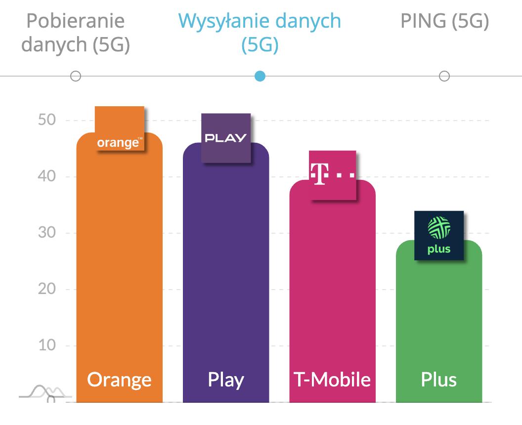W maju Orange utrzymał swoją pozycję lidera w kategorii średniej szybkości wysyłania danych 5G, osiągając wynik 47,9 Mb/s. Play zajął drugie miejsce z wynikiem 46,1 Mb/s, wyprzedzając T-Mobile, który uzyskał średnią prędkość wysyłania na poziomie 39,5 Mb/s. Zestawienie zamknął Plus z wynikiem 28,8 Mb/s.