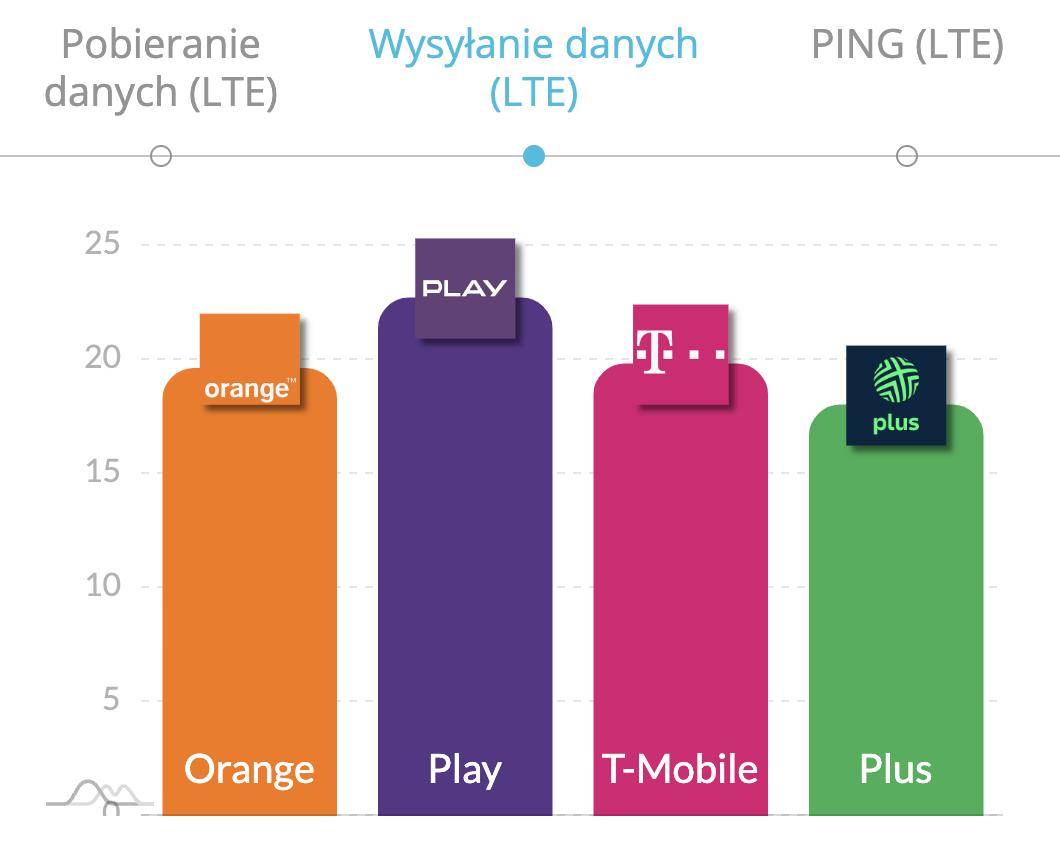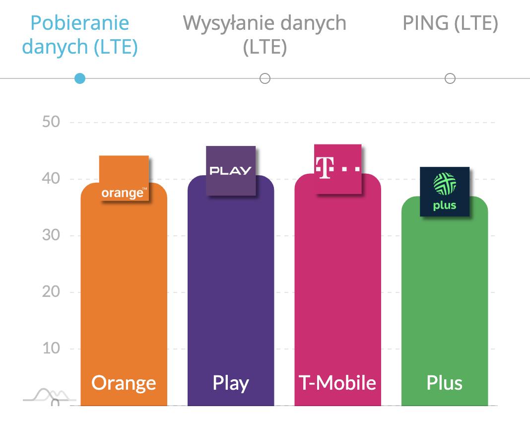 W segmencie 4G LTE T-Mobile nie zwalnia tempa, osiągając najwyższą średnią prędkość pobierania danych na poziomie 46,2 Mb/s, co wyraźnie wyróżnia go na tle konkurencji. Drugie miejsce zajął Play z wynikiem 41,3 Mb/s, a trzecie przypadło Orange, który osiągnął 38,8 Mb/s. Plus zajął ostatnią pozycję z prędkością 37,4 Mb/s. W kategorii średniej szybkości wysyłania danych 4G LTE, Play zajął pierwsze miejsce z wynikiem 23,6 Mb/s, wyprzedzając T-Mobile (20,7 Mb/s) oraz Orange (20,0 Mb/s). Plus ponownie znalazł się na końcu zestawienia z wynikiem 18,7 Mb/s. Najniższą wartość ping w technologii 4G LTE osiągnął Play z rezultatem 29 ms, wyprzedzając Orange (33,1 ms), T-Mobile (35,2 ms) oraz Plus (38,2 ms).