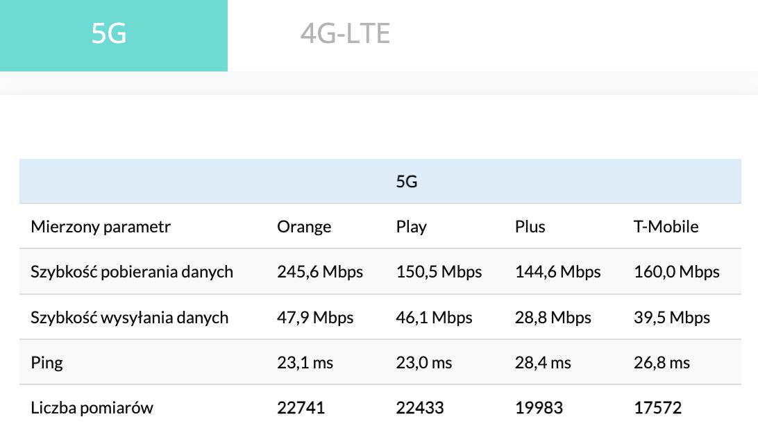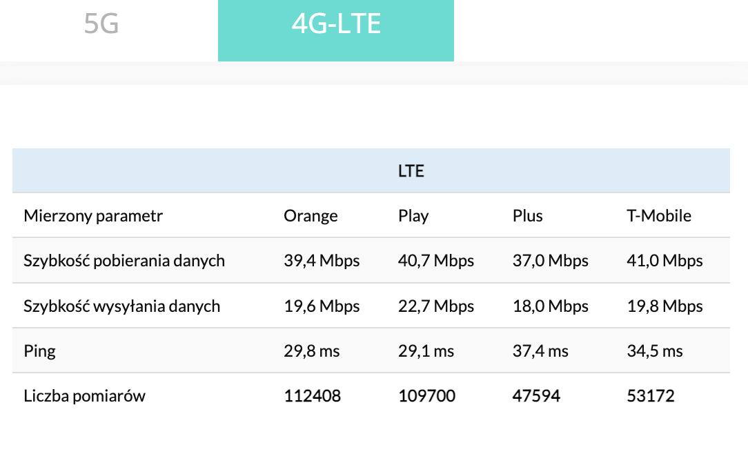 Tabela wyników 5G/4G LT