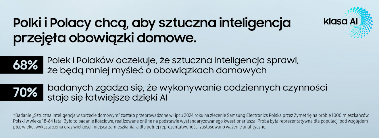 Sztuczna inteligencja coraz śmielej wkracza w różne sfery naszego życia, ale jak może wpłynąć na te codzienne, rutynowe obowiązki, które tak często pochłaniają nasz czas i energię? Czy AI może uczynić je prostszymi? Samsung, wprowadzając Klasę AI[1], pokazuje, że to możliwe. Przedstawiamy wyniki badania „Sztuczna inteligencja w sprzęcie domowym” zrealizowanego przez Zymetrię na zlecenie Samsung, które rzucają nowe światło na rolę AI w naszych domach.
