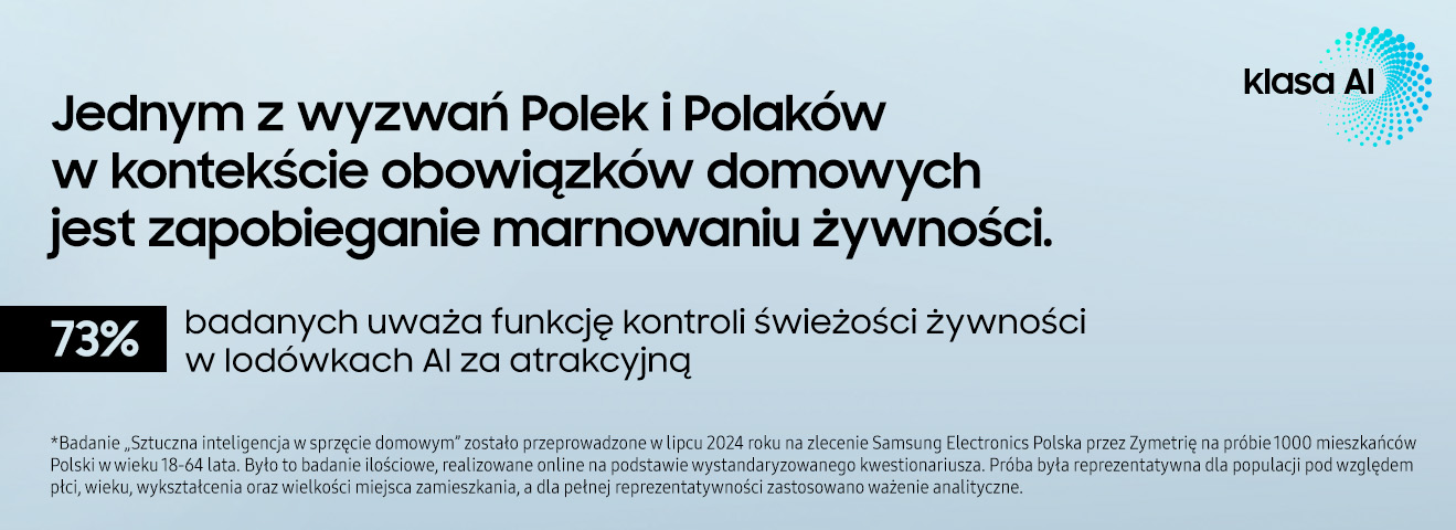 Tutaj również Samsung znalazł rozwiązanie w postaci funkcji „AI Vision” w lodówce Family Hub (jeden model X), która za pomocą inteligentnej kamery jest w stanie rozpoznać świeżość aż 33 różnych produktów spożywczych (wybranych warzyw i owoców). Kamera analizuje żywność na podstawie bogatej bazy zdjęć oraz algorytmów uczenia maszynowego, automatycznie aktualizując listę produktów na wyświetlaczu lodówki. Użytkownicy mogą ustawić czas przechowywania produktów i otrzymywać powiadomienia, gdy zbliża się koniec terminu ich przydatności. To rozwiązanie nie tylko oszczędza pieniądze, ale również pomaga zapobiegać marnotrawieniu żywności i wspiera ekologiczny tryb życia. Taka Lodówka Samsung z funkcją AI Vision potrafi także sugerować przepisy z wykorzystaniem dostępnych składników, co czyni ją niezwykle atrakcyjnym wyborem dla ¾ badanych Polek i Polaków.