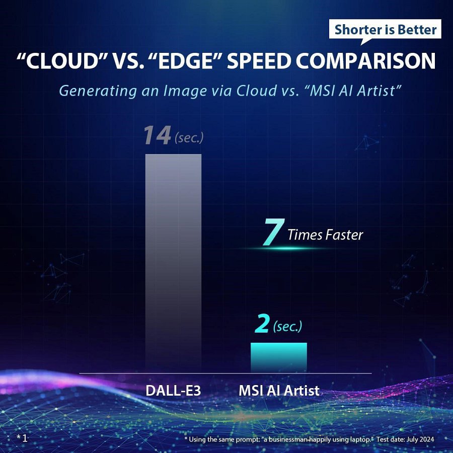 - Szybsze prędkości: Koniec z czekaniem na przesyłanie informacji z chmury. Edge AI pozwala na szybsze obliczenia i ogólnie szybszą wydajność. Na przykład „MSI AI Artist”, zaprojektowany specjalnie do tworzenia obrazów opartych na sztucznej inteligencji, przetwarza wszystkie dane bezpośrednio na laptopie. Skutkuje to nawet siedmiokrotnie szybszym generowaniem obrazów niż w przypadku tradycyjnego przetwarzania w chmurze (*1).