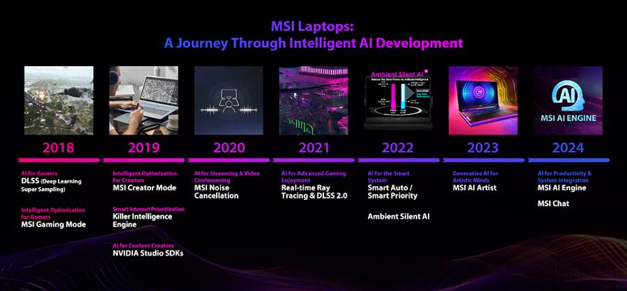 Przewidując przyszłość, MSI inwestuje w badania i rozwój sztucznej inteligencji od 2018 roku. Już w 2022 roku MSI wprowadziło koncepcję „Technologicznej Osobliwości”, zapowiadając wielką rewolucję technologiczną. W 2023 r. firma MSI urzeczywistniła tę wizję, wprowadzając na rynek pierwszą generację laptopów opartych na sztucznej inteligencji, co zapoczątkowało nową erę komputerów. Do 2024 r. firma MSI dokonała znaczącego skoku na rynku komputerów PC ze sztuczną inteligencją, prezentując imponującą gamę modeli AI nowej generacji, które wyznaczyły nowy standard w branży.