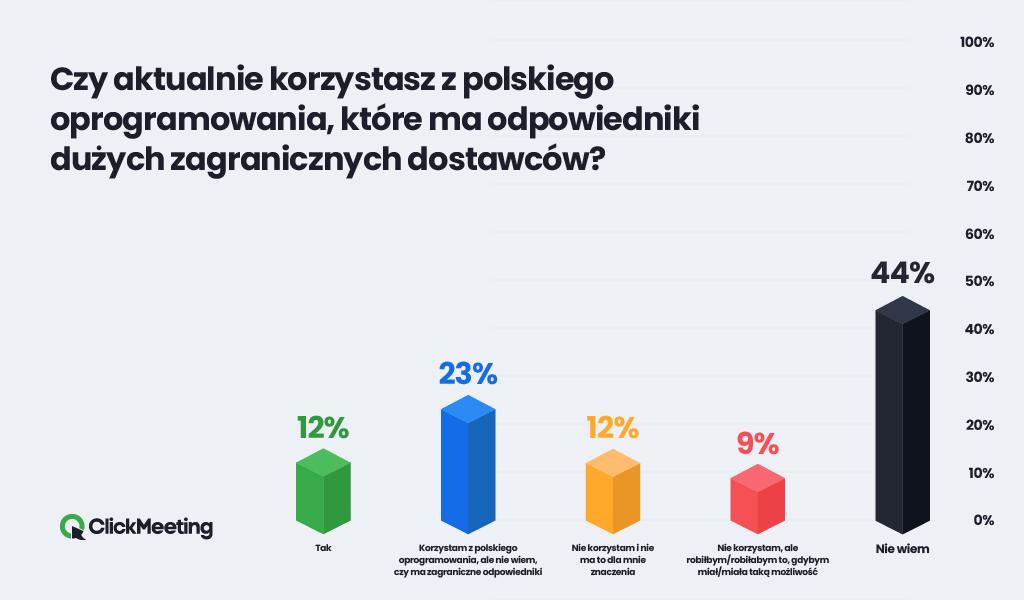 Mimo powyższych deklaracji 35 proc. badanych przyznaje, że faktycznie korzysta z polskiego oprogramowania. W przypadku blisko połowy z tej liczby jest to chat lub komunikator. Nieco ponad ¼ wskazała platformę do wydarzeń online i webinarów, a po 19 proc. – platformę edukacyjną lub szkoleniową oraz oprogramowanie księgowe. Niecałe 10 proc. wszystkich respondentów używałoby polskiego oprogramowania, gdyby miało taką możliwość, a 44 proc. nie zna pochodzenia wykorzystywanych przez siebie programów. Aż 28 proc. byłoby skłonne zapłacić więcej za program czy usługę ze względu na jego lub jej polskie pochodzenie.