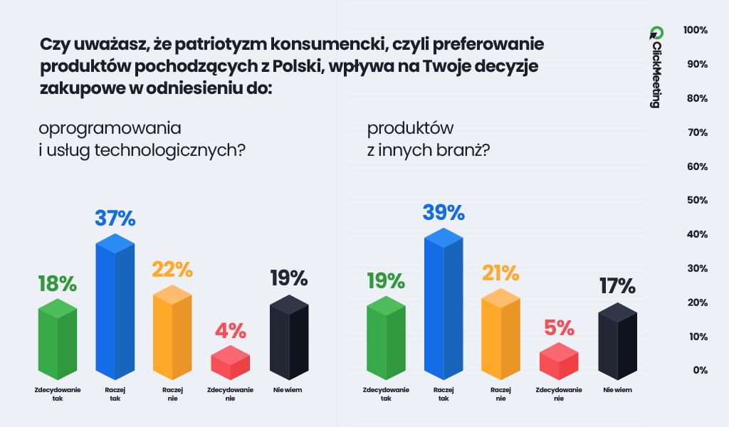 Patriotyzmem konsumenckim, czyli preferowaniem przy zakupie polskich produktów, najczęściej, według deklaracji, kierują się osoby w wieku powyżej 60 lat, a najmniejszą wagę przywiązują do niego osoby w pokolenia Z (od 18 do 27 lat). W przypadku zakupów oprogramowania i usług technologicznych taką postawę deklaruje 55 proc. badanych przez polski ClickMeeting. W pytaniu o to, z jakich polskich rozwiązań technologicznych korzystają, Polacy najczęściej wskazują: chat lub komunikator, platformę do wydarzeń online i webinarów, platformę edukacyjną lub szkoleniową oraz oprogramowanie księgowe.