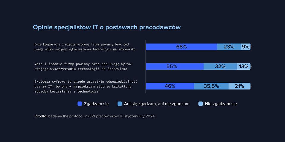 Specjalistki i specjaliści IT podkreślają, że ich zdaniem firmy powinny brać pod uwagę wpływ wykorzystania technologii na środowisko. Co więcej, już 7 na 10 badanych uważa, że dotyczy to przede wszystkim dużych korporacji i międzynarodowych firm, a mniej bo 55%, że także przedsiębiorstw z sektora małych i średnich firm. Przedstawiciele branży IT dostrzegają jednak nie tylko odpowiedzialność firm, lecz również własną. Zdaniem 58% respondentów z tej grupy indywidualne decyzje ekologiczne mają znaczenie, bowiem mogą inspirować do działania innych, wywołując tym samym efekt skali. 56% specjalistek i specjalistów IT uważa natomiast, że ekologia cyfrowa i ślad cyfrowy to wyzwanie dla całego współczesnego społeczeństwa. Niepokoić może z kolei, że istnieje spora grupa specjalistek i specjalistów IT (45%), którzy sądzą, że negatywny wpływ wykorzystania technologii na środowisko jest wyolbrzymiony.
