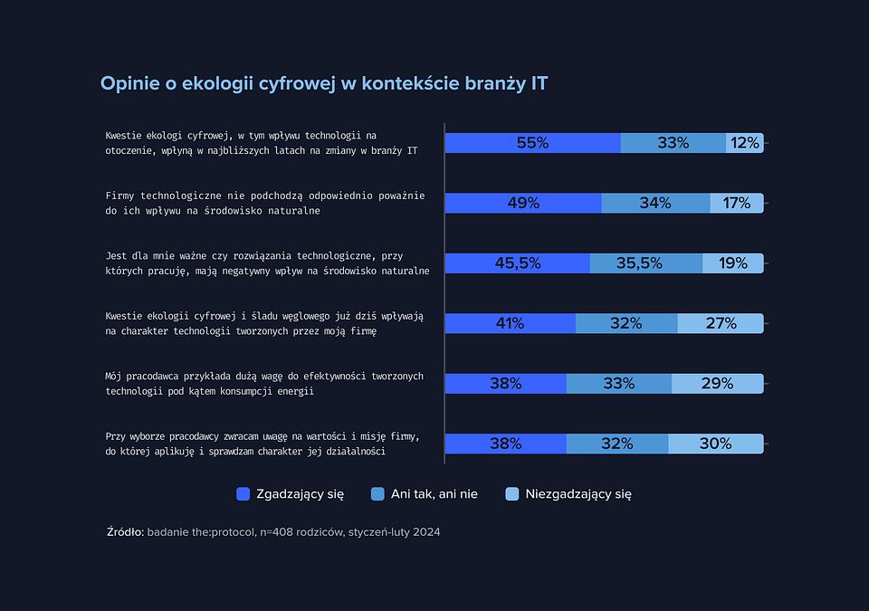 - 55% badanych specjalistek i specjalistów IT jest zdania, że zagadnienia związane z ekologią cyfrową będą źródłem zmian w branży IT w najbliższych latach.