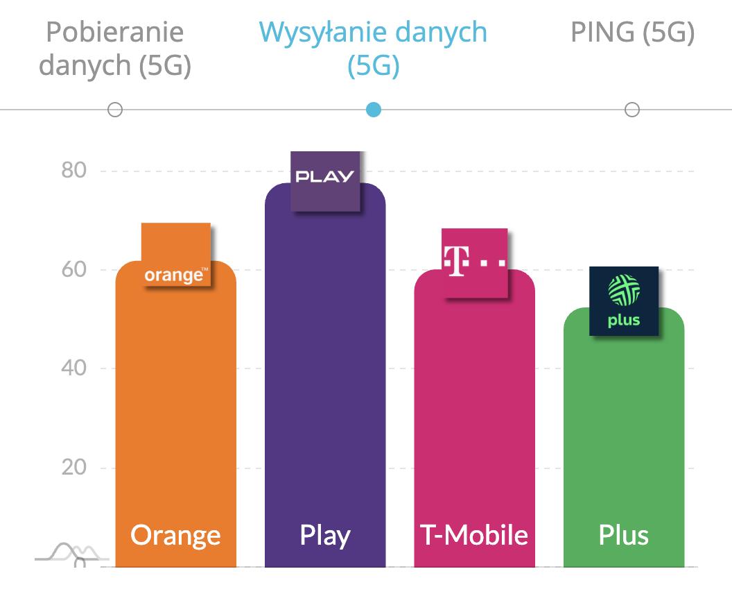 W przypadku wysyłania danych Play ponownie osiągnął najlepszy rezultat – 77,67 Mb/s. Orange (61,94 Mb/s) i T-Mobile (60,19 Mb/s) uzyskały zbliżone wartości, natomiast Plus wypada najsłabiej z wynikiem 52,49 Mb/s.