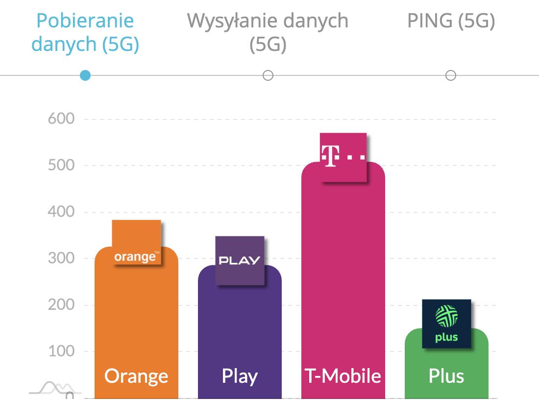 Różnice stają się bardziej widoczne w analizie przepustowości aplikacyjnej (P90), która odzwierciedla realne, doświadczane przez użytkownika prędkości. Pod względem pobierania bezkonkurencyjny okazał się T-Mobile, który osiągnął 508,97 Mb/s. To znacznie więcej niż drugi w zestawieniu Orange (326,63 Mb/s) i Play (286,93 Mb/s). Zdecydowanie najniższy wynik zanotował Plus (150,96 Mb/s).
