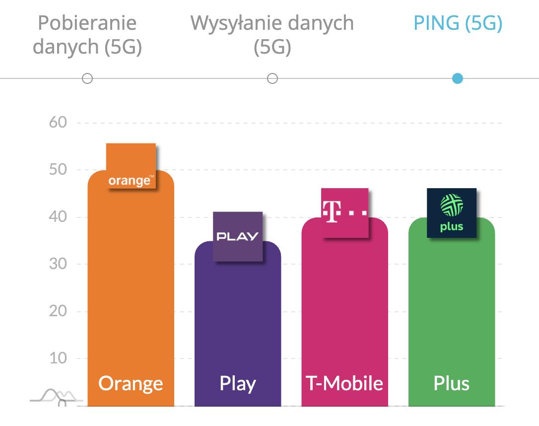 Pomiar średniego czasu odpowiedzi sieci (RTT – Round Trip Time) za pomocą testu ping (10x 32B PING – Ookla) pozwala ocenić, jak szybko urządzenie otrzymuje odpowiedź z serwera po wysłaniu zapytania. To kluczowy wskaźnik przy korzystaniu z usług wymagających niskich opóźnień, takich jak gry online, rozmowy wideo czy zdalna praca. Najlepszy wynik osiągnął Play, z opóźnieniem wynoszącym średnio 35 ms, co oznacza najbardziej responsywną sieć w tym zestawieniu. T-Mobile i Plus uzyskały identyczny wynik – 40 ms, co również świadczy o dobrej jakości połączenia. Najwyższy czas odpowiedzi zanotowano w sieci Orange – 50 ms, co choć nadal mieści się w akceptowalnym zakresie, może być mniej komfortowe przy intensywnym, interaktywnym użytkowaniu Internetu.