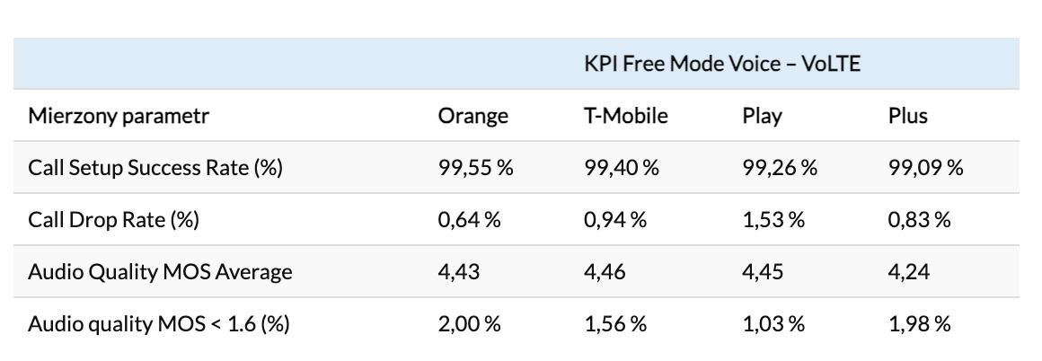 Dane dotyczące połączeń głosowych VoLTE pokazują, że wszyscy operatorzy osiągnęli bardzo wysoki poziom skuteczności zestawiania połączeń, jednak jakość rozmów i stabilność połączenia różniły się w zależności od sieci.