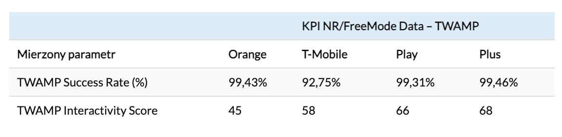 Pod względem skuteczności pomiarów TWAMP najlepiej wypadł Plus, osiągając wynik 99,46%, co oznacza niemal bezbłędne działanie testów. Tuż za nim uplasowali się Orange (99,43%) i Play (99,31%), także z bardzo wysokimi wynikami. Wyraźnie gorzej poradził sobie T-Mobile, notując zaledwie 92,75%, co może wskazywać na większą liczbę błędów transmisji lub utratę pakietów w tej sieci.