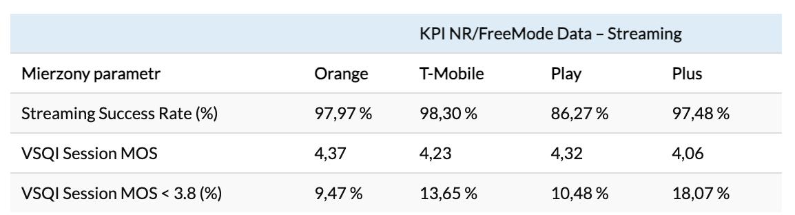 Pod względem skuteczności rozpoczęcia odtwarzania (Streaming Success Rate) najlepiej wypada T-Mobile (98,30%), tuż za nim Orange (97,97%) i Plus (97,48%). Najsłabiej wypadł Play, gdzie sukces odtwarzania osiągnął jedynie 86,27%, co może wskazywać na problemy z inicjalizacją streamu w tej sieci.