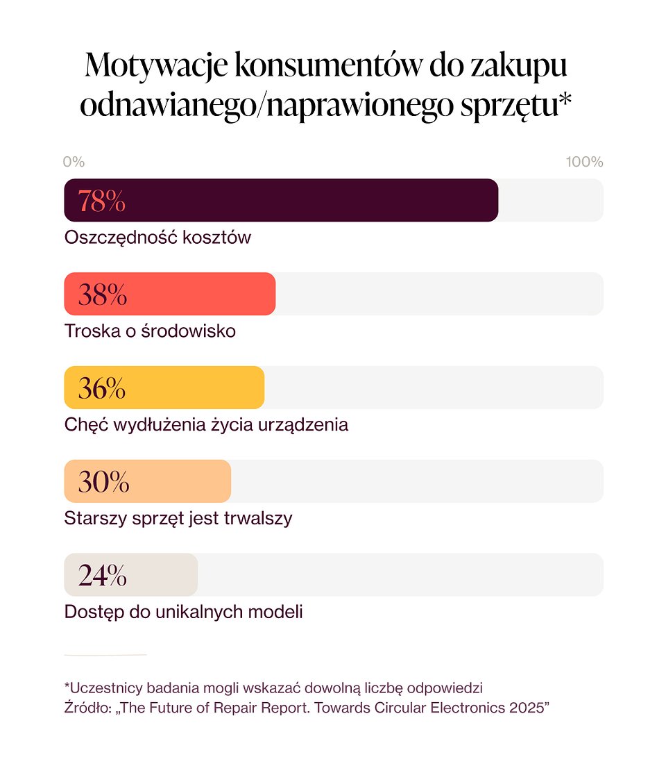 Nowy trend potwierdzają wyniki raportu opracowanego przez FIXIT SA, firmę specjalizującą się w obsłudze posprzedażowej dla sektora elektroniki użytkowej. Z dokumentu zatytułowanego The Future of Repair Report. Towards Circular Electronics 2025 wynika m.in., że dla ponad 80 proc. klientów możliwość naprawy jest jednym z kluczowych czynników wpływających na wybór nowego urządzenia. Systematycznie rośnie także liczba osób otwartych na zakup urządzeń używanych lub profesjonalnie odnowionych. W grupie tej aż 78 proc. zwraca uwagę na oszczędności, a 38 proc. na korzyści dla środowiska naturalnego.