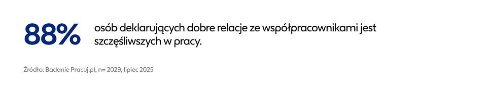 - 88% osób deklarujących dobre relacje ze współpracownikami jest szczęśliwszych w pracy.