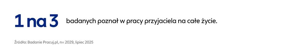 Te liczby pokazują, że biuro czy przestrzeń online mogą być początkiem więzi, które stają się ważną częścią naszego prywatnego świata. Praca to nie tylko obowiązki i projekty, ale też relacje. Bliscy znajomi czy przyjaciele poznani w biurze mogą być źródłem wsparcia, radości i poczucia przynależności. Takie więzi wzmacniają integrację zespołu, ułatwiają współpracę i sprawiają, że czujemy się częścią czegoś większego niż tylko firma – komentuje Alina Michałek, HR Business Partner w Pracuj.pl
