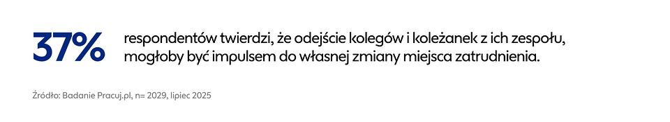 Dobre relacje w zespole mogą być jednym z najskuteczniejszych czynników wpływających na poczucie stabilności zatrudnienia. Dane pokazują, że wśród osób zadowolonych z kontaktów w pracy zmianę miejsca zatrudnienia rozważa jedynie 29%, podczas gdy wśród niezadowolonych odsetek ten sięga aż 59%. Co więcej, dla 37% pracowników odejście kolegów i koleżanek z zespołu mogłoby być impulsem do własnych zmian, a 74% deklaruje, że w nowym miejscu chciałoby trafić na zespół podobny do obecnego. Dla niemal połowy badanych (48%) to właśnie atmosfera jest powodem, dla którego zostają w obecnej firmie.