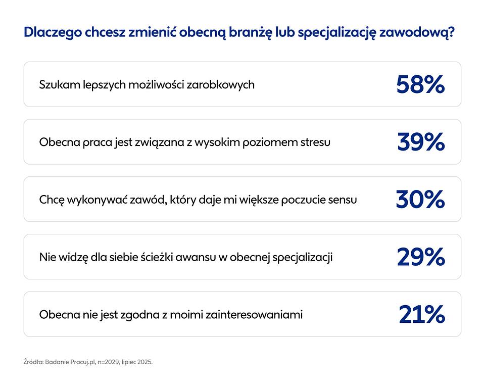 Powody decyzji o zmianie specjalizacji zawodowej są zróżnicowane. Najczęściej badani wskazują poszukiwanie lepszych możliwości zarobkowych (58%). Jednocześnie 39% zwraca uwagę na stres towarzyszący obecnej pracy, a 30% chciałoby wykonywać zawód dający większe poczucie sensu. Dla 29% problemem jest brak perspektyw awansu w dotychczasowej specjalizacji.
