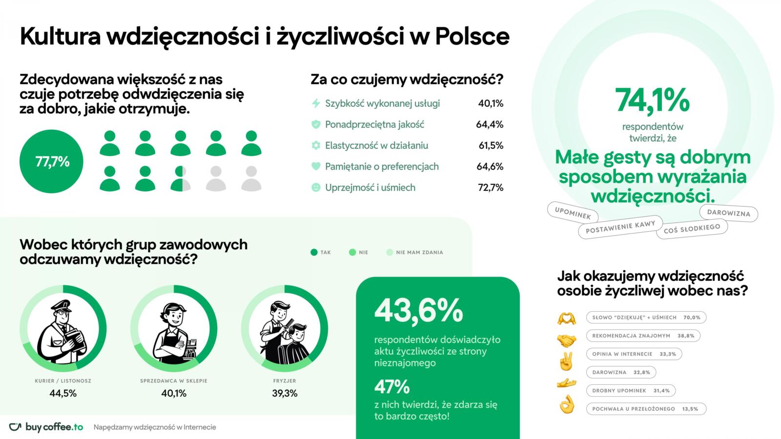 „Wyniki badań jednoznacznie wskazują, że Polacy pragną wyrażać wdzięczność nie tylko w obliczu wyjątkowych wydarzeń, ale również doceniając codzienne usługi, które podnoszą komfort życia. Wirtualna kawa stanowi pomost łączący głęboko zakorzenioną kulturę życzliwości z nowoczesnymi rozwiązaniami cyfrowymi. Jest to szybki, intuicyjny i zgodny z polską tradycją sposób na wyrażenie podziękowania” – podsumowuje Piotr Kędzia, Prezes Zarządu Coffee Media sp. z o.o. właściciela serwisu www.buycoffee.to