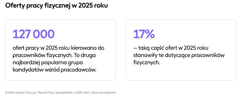 Sektor pracy fizycznej pozostaje jednym z filarów polskiego rynku zatrudnienia, utrzymując w 2025 roku swoją silną pozycję. Oferty skierowane do pracowników fizycznych stanowiły 17% wszystkich ogłoszeń opublikowanych w serwisie.