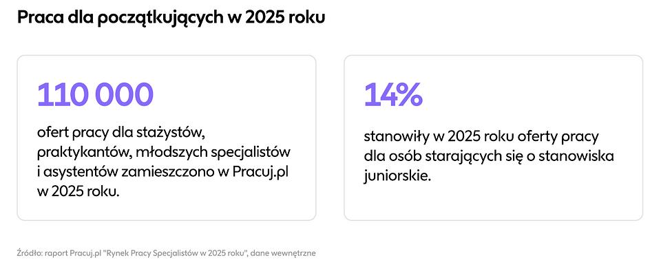 W 2025 roku rynek pracy dla osób stawiających pierwsze kroki w karierze utrzymał zbliżony udział w ogólnej puli rekrutacji. Oferty skierowane do stażystów, praktykantów, młodszych specjalistów oraz asystentów stanowiły 14% wszystkich ogłoszeń opublikowanych w serwisie Pracuj.pl. Oznacza to, że mimo wyzwań gospodarczych oraz intensywnej dyskusji wokół wpływu sztucznej inteligencji na rynek pracy, pracodawcy nadal rezerwują istotną część wakatów dla kandydatów wymagających wdrożenia, inwestując w budowę kadr od podstaw.