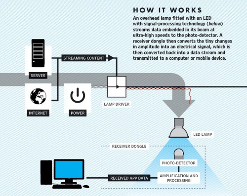 Technologia Li-Fi, wykorzystująca działanie światła widzialnego, pozwala przesyłać dane z prędkością ponad 200 gigabitów na sekundę, czyli niemal stokrotnie większą niż w przypadku Wi-Fi. Sygnał przekazywany jest za pomocą np. żarówek LED. Sieci Li-Fi są odporne na ataki hakerów i zakłócenia elektroenergetyczne. Nowa technologia może znaleźć zastosowanie między innymi w szpitalach, kopalniach i służbach specjalnych.