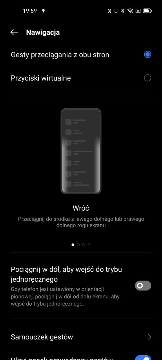Niestety nie znajdziemy w nim diody powiadomień ani AOD („ekran zawsze aktywny”). Możemy również włączyć obsługę gestami lub standardową dolną belkę z przyciskami oraz inteligentny pasek boczny. Zatem każdy bez problemu znajdzie swoją ulubioną konfigurację interfejsu i nawigacji.