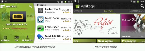 Porównanie dotychczasowej wersji Android Market z nadchodzącą, nową.