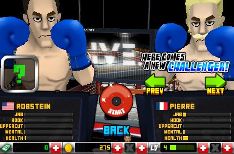 Po wybraniu imienia dla naszego zawodnika możemy przystąpić do pierwszego pojedynku. Bez względu na wynik otrzymujemy większe, (wygrana) bądź mniejsze (przegrana) pieniądze za które będziemy mogli wykupić odpowiednie cechy i umiejętności przydatne podczas starć. Podobna rzecz ma się z nabywaniem elementów wyglądu i wyposażenia naszego boksera.
