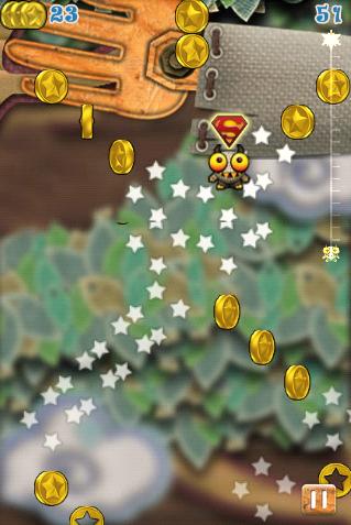 Im więcej monet zbierzemy podczas naszego wzbijania się w górę tym lepiej. Po drodze czekać na nas będą różnego rodzaju pułapki, fałszywki monet od których nie da się odbić oraz specjalne bonusy zwiększające możliwości naszego stworka. Do ciekawszych z nich należy zaliczyć supermana (gwałtowny wystrzał w górę z przyciąganiem do siebie wszystkiego co jest w pobliżu), skrzydła nietoperza (bonus do zasięgu odbijania w górę) czy też balon (pompujący naszą postać do 4 krotnie większych rozmiarów).