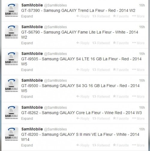 Wśród sprzętu, jaki zobaczymy niebawem w wersji La Fleur znajduje się model Galaxy S4, Galaxy Trend, Galaxy Core, Galaxy S III Mini i Galaxy Fame Lite. W drugim tygodniu stycznia do sprzedaży ma wejść czerwona wersja Trend’a oraz biała Fame’a. Na początku lutego zobaczymy czerwonego Galaxy S4 w wersji 3G oraz LTE.