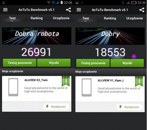 Jeśli chodzi o wydajność, zarówno X2 Twin, jak i Viper i, radzą sobie naprawdę dobrze, chociaż w tej dziedzinie na prowadzenie wychodzi X2 Twin. Niestety, Vipera i kilka razy udało mi się zawiesić, i to tak, że nawet trudno go było uruchomić ponownie. Zdarzało się to podczas uruchamiania standardowych aplikacji, takich jak Internet czy Pogoda. W obu modelach znajdziemy 1 GB pamięci RAM oraz procesory MediaTek z rdzeniami ARM Cortex A7: w większym jest to 8 rdzeni o taktowaniu 1,4 GHz z grafiką Mali-450, a w mniejszym 4 rdzenie o taktowaniu 1,3 GHz z grafiką Mali-400. Przekłada się to odpowiednio na wyniki: 26991 oraz 18553 punkty w benchmarku AnTuTu. W praktyce telefony pracowały szybko i nie trzeba było na nie czekać. Obie słuchawki wyposażono w 8 GB pamięci wbudowanej, z czego w X2 Twin dla użytkownika dostępne jest 5,65 GB, a w Viperze i – 3,7 GB.