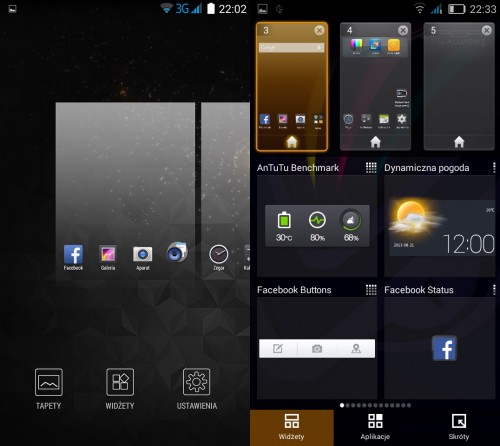 X2 Twin to telefon, któremu zdecydowanie bliżej do „czystego” Androida. Wystarczy spojrzeć na menu ustawień ekranu, które tylko nieznacznie odbiega od tego w KitKacie: mamy tu do wyboru tapety, widżety i ustawienia. W Viperze i wygląda to zupełnie inaczej, trochę bardziej chaotycznie. U góry możemy dodawać ekrany a na dole wyświetlane są widżety, aplikacje oraz skróty. Tapety, a nawet efekty przechodzenia między ekranami zmienimy z poziomu specjalnego widżetu.