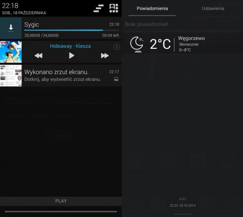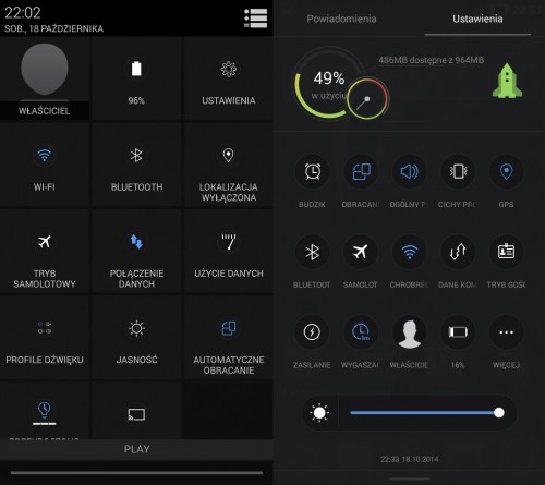 Centrum powiadomień w obu telefonach podzielono na 2 zakładki. Jedna zawiera powiadomienia a druga skróty do potrzebnych funkcji. W Viperze ikony są mniejsze, a ponadto możemy podejrzeć, ile procent pamięci RAM wykorzystuje w danej chwili nasz smartfon. Pod ręką mamy również regulację jasności. Jeśli jesteśmy już przy powiadomieniach, warto dodać, że X2 Twin został wyposażony w diodę powiadomień, która znajduje się nad ekranem, jednak jest dość kapryśna i nie zawsze chciała się zaświecić.
