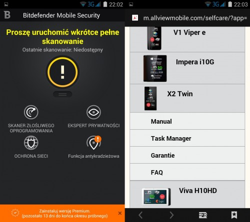 W obu telefonach znajdziemy bardzo podobny zestaw aplikacji, jednak na pełne wersje komercyjnych programów nie mamy co liczyć. Antywirus Bitdefender to zaledwie 14-dniowa wersja próbna, za którą musimy zapłacić 32,95 zł, jeśli chcemy jej używać przez rok. A ciekawie brzmiąca aplikacja Selfcare to tylko skrót do strony AllView, z której możemy pobrać instrukcje do telefonu, informacje dotyczące gwarancji czy odpowiedzi FAQ, na dodatek w języku rumuńskim.