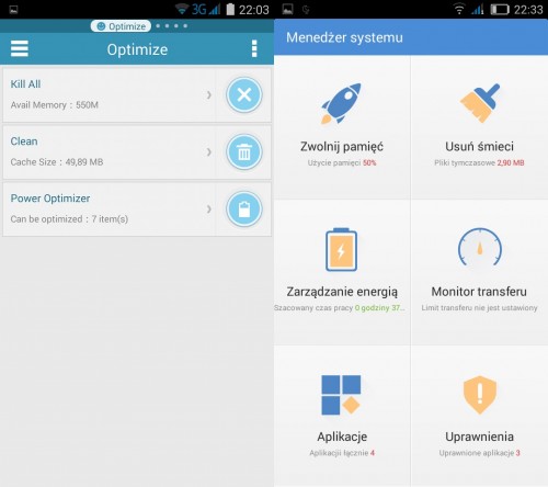 Podobnie jest w przypadku Menadżera zadań ES (w X2 Twin) i Menedżera systemu (w Viperze i). Ten pierwszy jest po angielsku i oferuje „zabicie” wszystkich procesów, usunięcie niepotrzebnych plików oraz zarządzanie energią. Ten drugi nie dość, że jest bardziej atrakcyjny wizualnie, pozwala także na monitorowanie naszego transferu danych, zarządzanie zainstalowanymi aplikacjami oraz zmianę uprawnień nadanych określonym aplikacjom. Naprawdę przydatne funkcje.