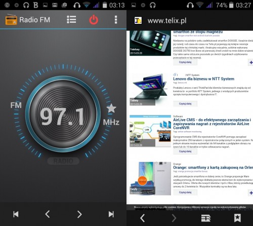 Smartfon posiada wbudowane radio FM, które bardzo dobrze wyszukało 11 stacji. Dźwięk na słuchawkach jest przeciętnej jakości, a jeśli chodzi o zewnętrzne głośniki stereo, są one przede wszystkim głośne. Ich jakość również jest zadowalająca.