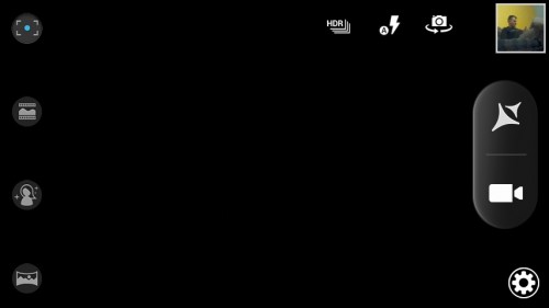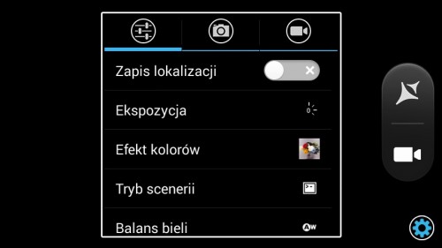 Często używane opcje, takie jak HDR, ustawienia lampy błyskowej oraz przełączenie aparatów, są zawsze pod ręką w prawym, górnym rogu. Pod ikoną koła zębatego znajdziemy więcej ustawień, takich jak ekspozycja, tryby scenerii, balans bieli, ISO, samowyzwalacz, efekty itp.