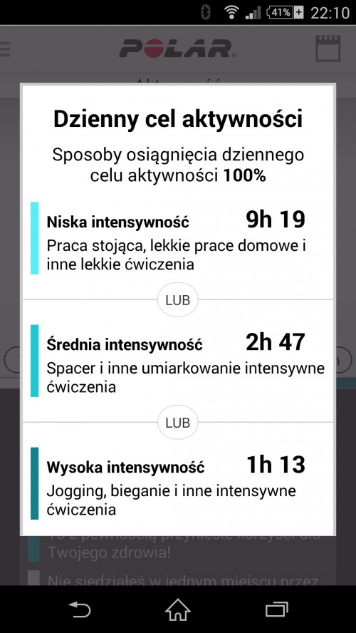 Polar Loop monitoruje naszą aktywność na pięciu poziomach intensywności: odpoczynek, siedzenie, niski, średni i wysoki. Mierzy aktywność na różnych poziomach (niski, średni, wysoki) – im wyższy poziom, tym szybciej osiągniemy swój cel. W przypadku bransoletki Polar Loop „UP” oznacza niską, „WALK” – średnią, a „JOG” – wysoką intensywność.